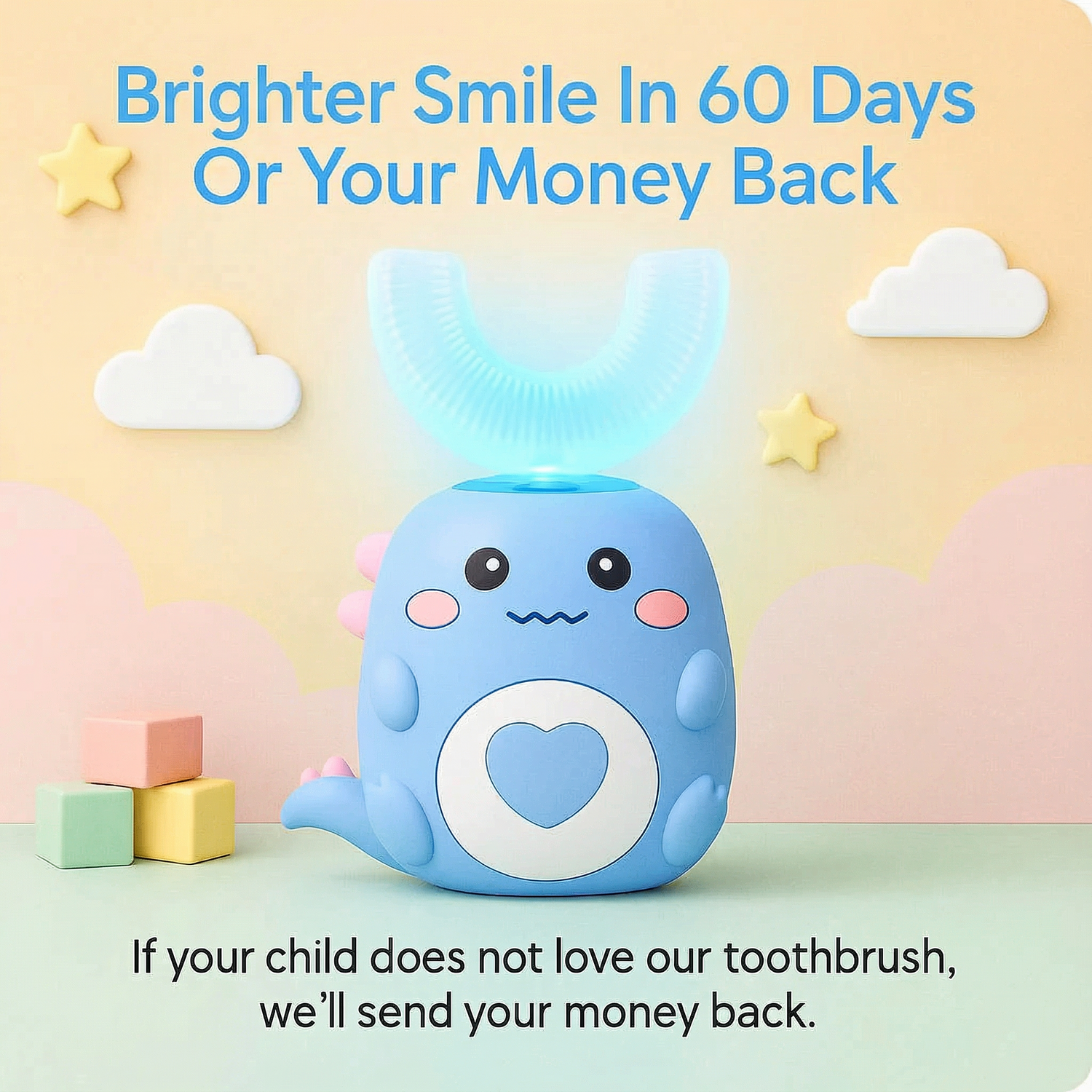Try it for 60 days, and if your child doesn’t love their new brushing buddy (or you don’t notice a cleaner, brighter smile), we’ll give you your money back — no questions asked.